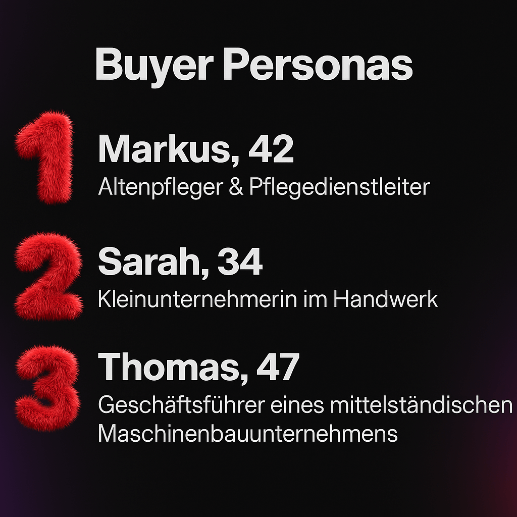 - Pain Points: Kein Marketing-Team, wenig Budget, fehlendes Wissen.