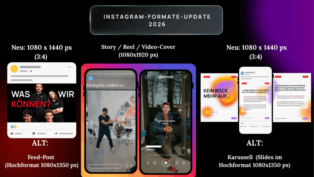 | Feed-Posts / Karussell | 1080 × 1350 px (Hochformat, 4:5) Neu: 1080 x 1440 px (3:4) |